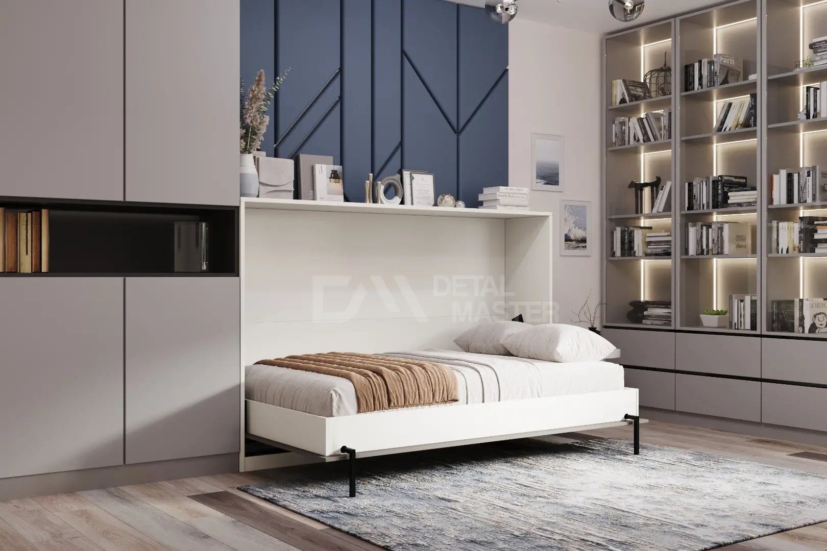 Горизонтальная шкаф-кровать "Solo Start".  Работает на механизме раскладывания собственной разработки "Start". Кровать раскладывается легким движением руки, превращаясь в полноценное спальное место. Просто потяните ее за ручки, расположенные на фасаде и выставите ножки-опоры.
